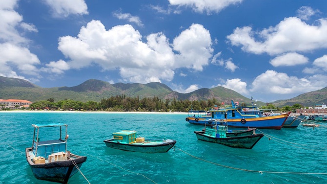 Vietnamese fishing boats on a tropical Con Dao Island.