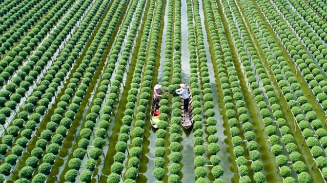 Taking care of flowers in Sa Dec Flower Village in Dong Thap Province, Vietnam