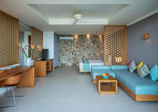 Room decor is the perfect harmony of minimalist and California beach green style. The rooms are spacious, and you can choose one that overlooks the lush garden, the ocean, or sit right beside the white sand. All the resort rooms are fully equipped with air conditioning, wi-fi, flat-screen TV, and a free beverage corner.