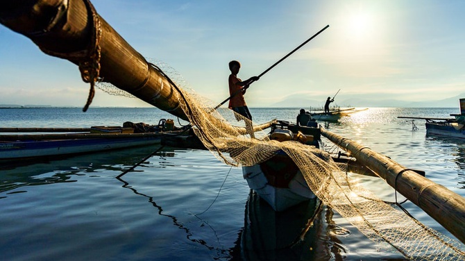 Catching freshwater fish in nature river in the early morning at Dau Tieng lake, Tay Ninh, Vietnam