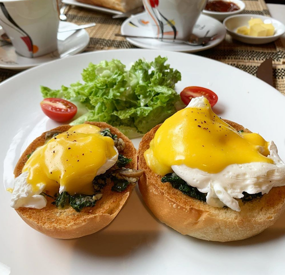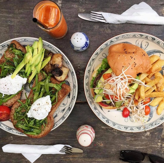 Maison de Tet Décor has its fair share the tranquility of a flower-filled courtyard and a leafy terrace atop 2 levels of the dark tile floor. Unlike other cafés serving usual favorites like French toast, eggs benedict, and Muesli, Maison De Tet Décor creates a great breakfast all-day café-dining style with variations on classics such as eggs Florentine served with herbed potato cake and French toasts with passion syrup. Uniquely, all fruits and herbs used in the restaurant are freshly grown by the locals. Prices vary from 60.000 to 130.000 VND for a large-sized portion.