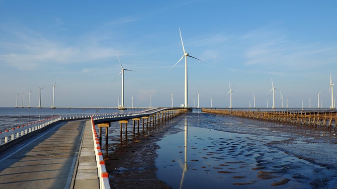 Group of wind turbines of Bac Lieu wind power plant at Mekong Delta