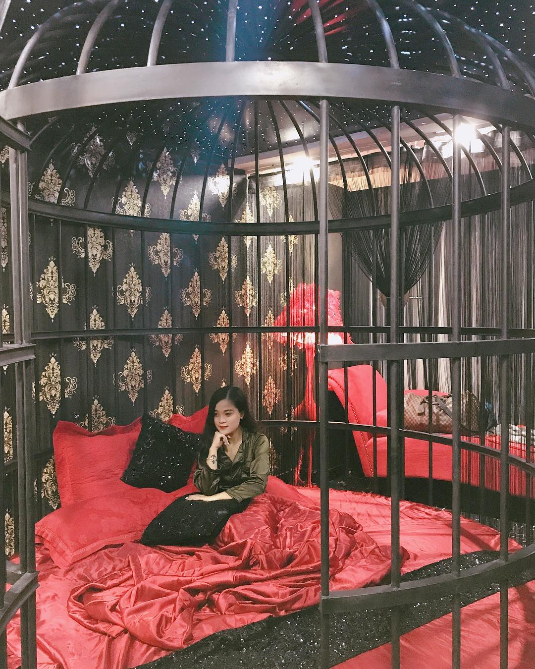 1001 Night Hotel boasts an exotic, not-to-miss hotel for couples on their romantic honeymoon in Ho Chi Minh City. A dark bedroom where the bed is placed inside a giant iron birdcage and embraced by a sparkling galaxy definitely captures your own senses. Additionally, the room interior features a harmony of red and black colors, not too bright and not too dark. This results in a mysterious and a bit scary ambiance.