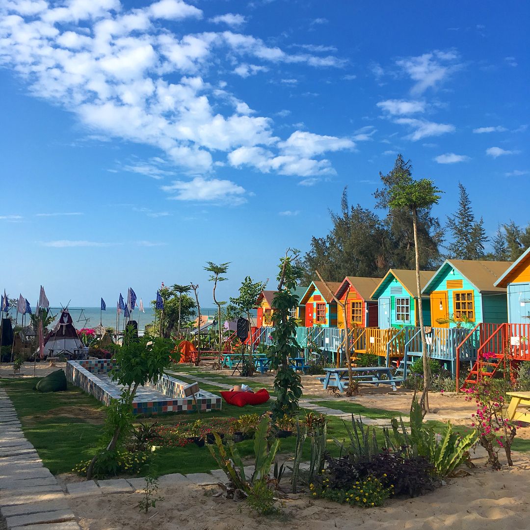 The beachfront, environmentally-friendly Coco Beachcamp La Gi is an ideal base for groups of friends with exciting team-building activities. This beach camp comprises a scattering of standalone and colorful tents, well-appointed with decent facilities like mattresses, blankets, and electric fans. There are sun loungers and dining tables with shades alongside the shoreline for guests to enjoy drinks and snacks or simply relax.