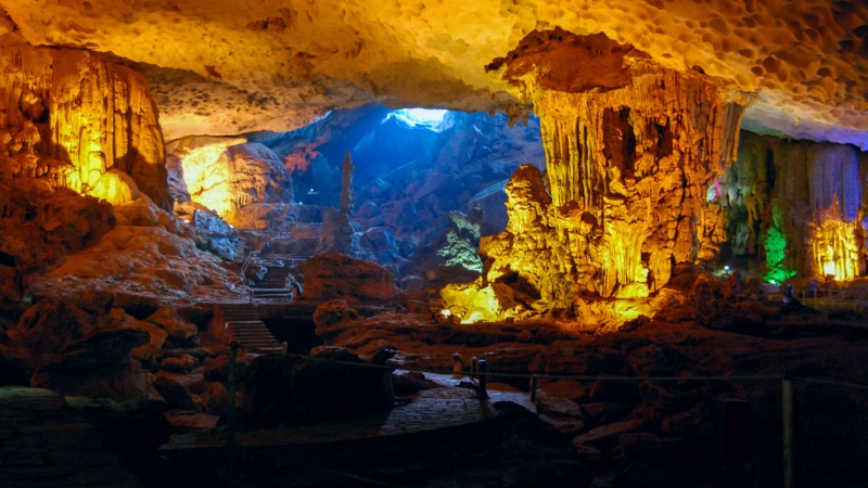 Sung Sot Cave is the largest and most beautiful cave in this heritage’s center. The cave gathers a tremendous system of stalactites and stalagmites in various shapes, presenting the superlative creation of mother nature. The trail to Sung Sot Cave is through a forest canopy with rocky steps, making an ultimate excitement when climbing to the top. This place welcomes thousands of visitors every day as a must-visit on your Halong Bay bucket list.