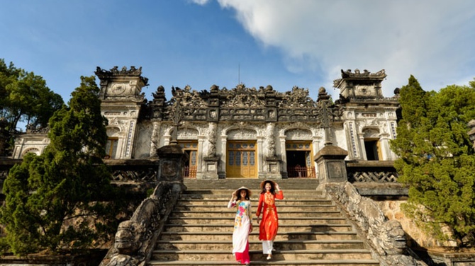 Beautiful women in Ao Dai at Khai Dinh Tomb, Hue , Vietnam
