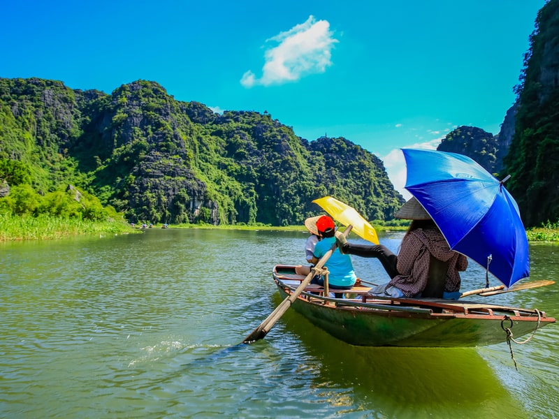 Tourists on rowing boats in Ninh Binh, Vietnam