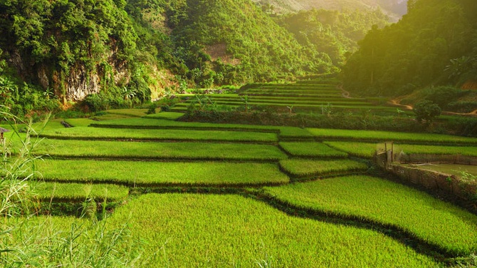 Sun light on Green Terraced Rice Field in Mai Chau District, Vietnam