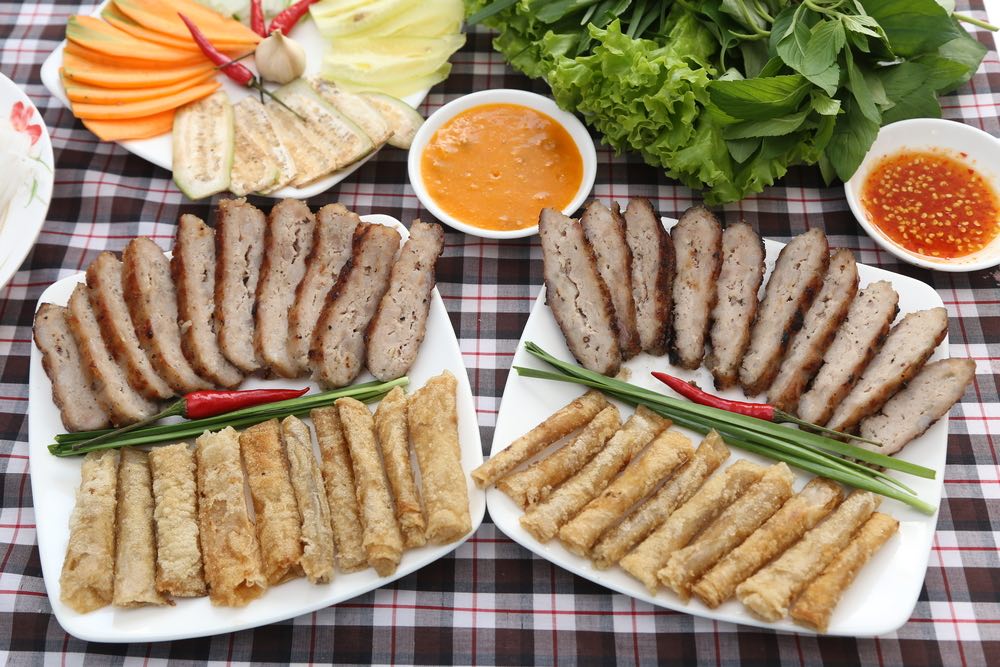 Nem nuong or grilled fermented pork roll has become an iconic dish of Nha Trang for years. The pork is rolled with rice vermicelli, carrot, cucumber, lettuce, green mango in rice paper and dipped into a sweet, sour, and spicy dipping sauce. Since all ingredients are set aside, you can feel free to wrap things you like and make your own perfect Nem nuong Nha Trang.