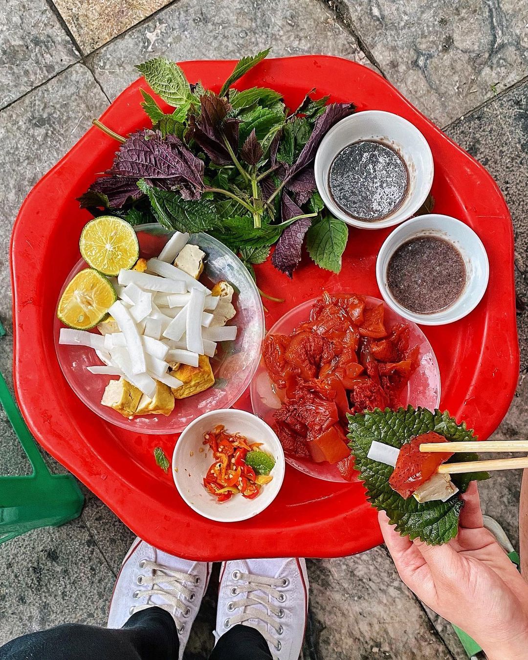 This Hanoi's challenging summer specialty is in fact originated in coastal areas like Hai Phong Province, for example. At first, freshly-caught red jellyfish will undergo a preparation process. Pieces of pickled jellyfish and fried tofu are then wrapped in a perilla leaf and then dipped into "mam tom" - a kind of savory shrimp paste. This delicate combination is complete with a slice of lemon, copra, and fresh herbs for a wonderful aroma and flavor.