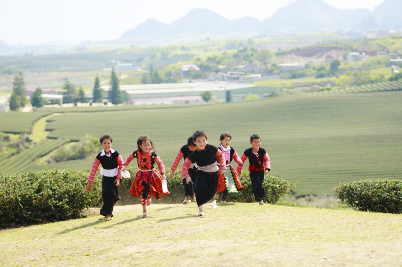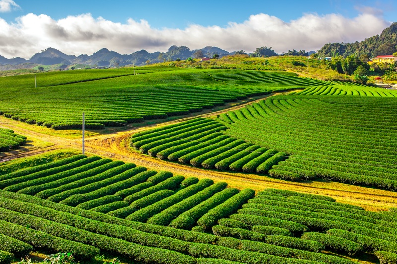 One cannot go without mentioning the famous tea plantation of Moc Chau. Midsummer, the land is lightened up by the waving green of fresh tea leaves, all valleys, and hills. Cared by farmers' utmost concentration, these plantations have lured many visitors in, not only to fix on its amazing view but also to reap the harvest products.