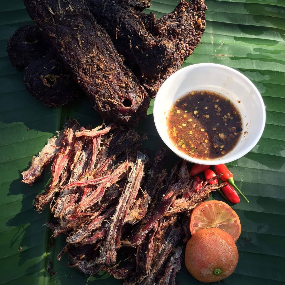 Beef chunk marinated with mountainous spices, placed in the kitchen to slowly dry, smoked by waft and waft of the cooking fire, that is how this Gac Bep delicacy was born. The outside is burning-black, but the inside still remains fresh meat-redness. Add a little chili, lemon, or salt to your liking and eaten strings by strings as snacks.