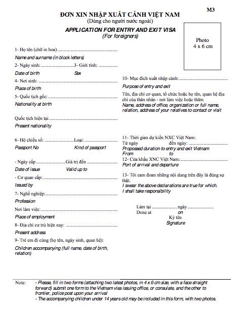 M3 is required of all foreign passengers arriving in Vietnam by air. The form will be handed out to you either on the airplane or when you arrive at a Vietnam airport. After you fill in the form, please return it to the immigration officer who will stamp your passport with a visa-on-arrival, or give you an entry stamp if you already have a pre-arranged visa. You can also save time by downloading the form and filling it in advance.